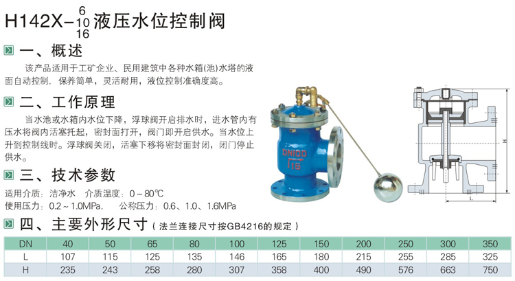 H142X型液壓水位控制閥,H142X型液壓水位控制閥原理、技術(shù)參數(shù),H142X型液壓水位控制閥尺寸。H142X型液壓水位控制閥屬于全自動水位控制閥,不需要電,全自動工作模式,是一種自動控制水箱、水塔液面高度的水力控制閥。規(guī)格口徑DN40到DN200。