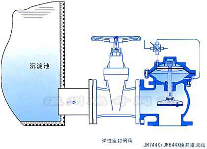 快開液動氣動排泥閥JM744X/JM644X,是一種由液壓源或氣動泊作執(zhí)行機構(gòu)的角型截斷類閥門。通常成排安裝在常常池底部外側(cè)壁,用以排除池底常常的泥砂和污物。該閥由尼龍強化橡膠隔膜將閥門分為兩啊腔室,接通液壓或氣動源,采用電動或手動二位四通換向閥控制,實現(xiàn)快速排泥。該閥將隔膜代替活塞,無運動摩擦,更適用于泥漿等顆粒介質(zhì),大大提高了閥門的使用壽命。