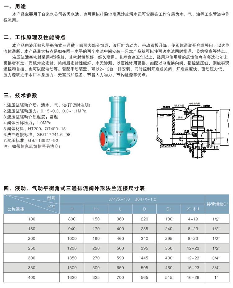 液動(dòng)、氣動(dòng)平衡角式三通排泥閥由液壓缸和平衡角式三通截止閥兩大部分組成,液壓缸為動(dòng)力、帶動(dòng)閥板升降,使閥體通道開啟或關(guān)閉,以達(dá)到流體通斷,液動(dòng)三通排泥閥,氣動(dòng)三通排泥閥最大特點(diǎn)是如在同一水平的兩個(gè)水池中間安裝一只本產(chǎn)品就可以使兩邊水池同時(shí)排泥,節(jié)約投資等特點(diǎn)。